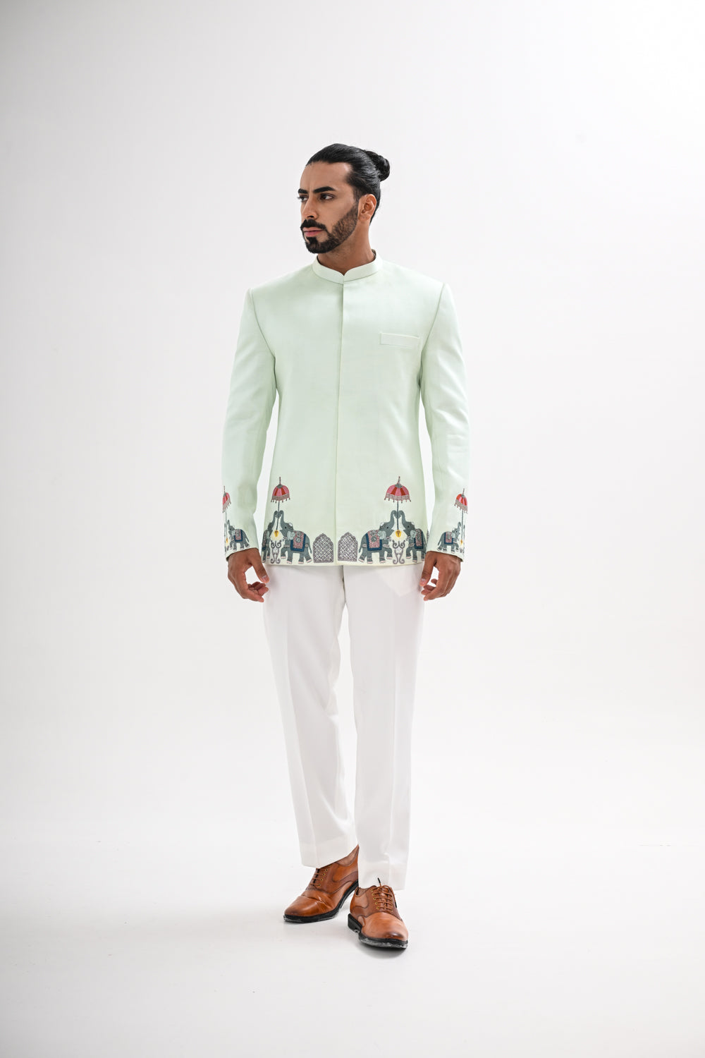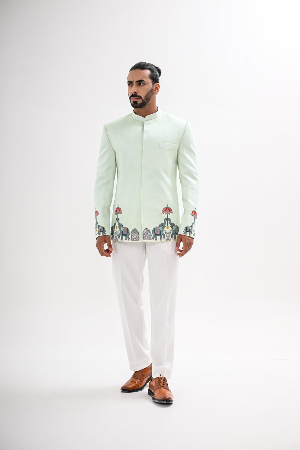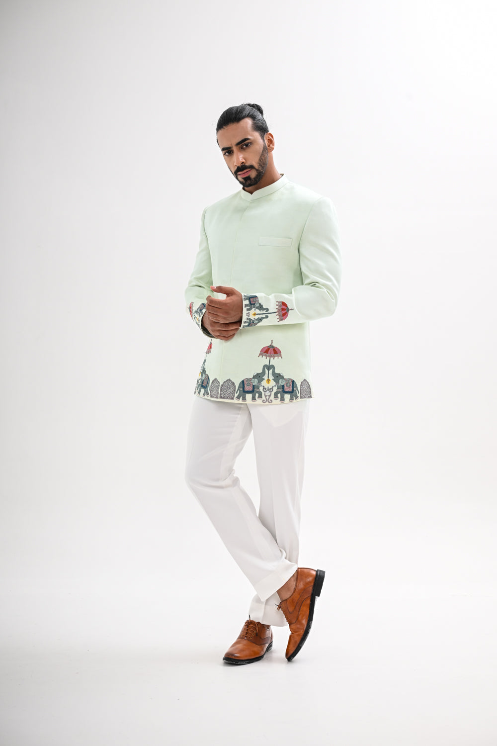 An exquisite handmade hand-embroidered light green Bandhgala Set, thoughtfully crafted on fine linen satin fabric. This elegant two-piece ensemble features a hand-embroidered Bandhgala paired with tailored trouser, reflecting a perfect balance of tradition and contemporary style. Please note, the actual color of the garment may vary slightly due to lighting conditions during photography.