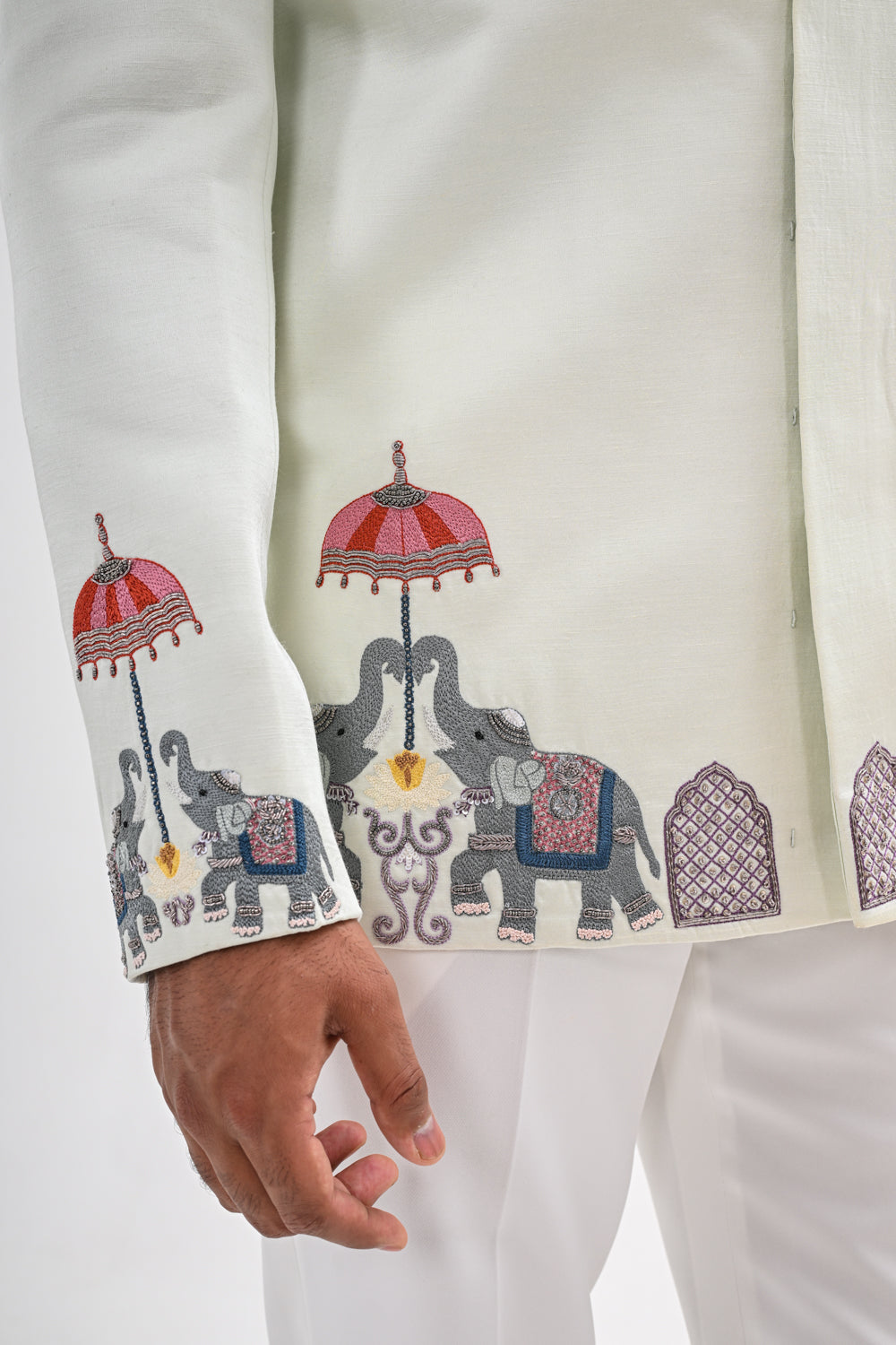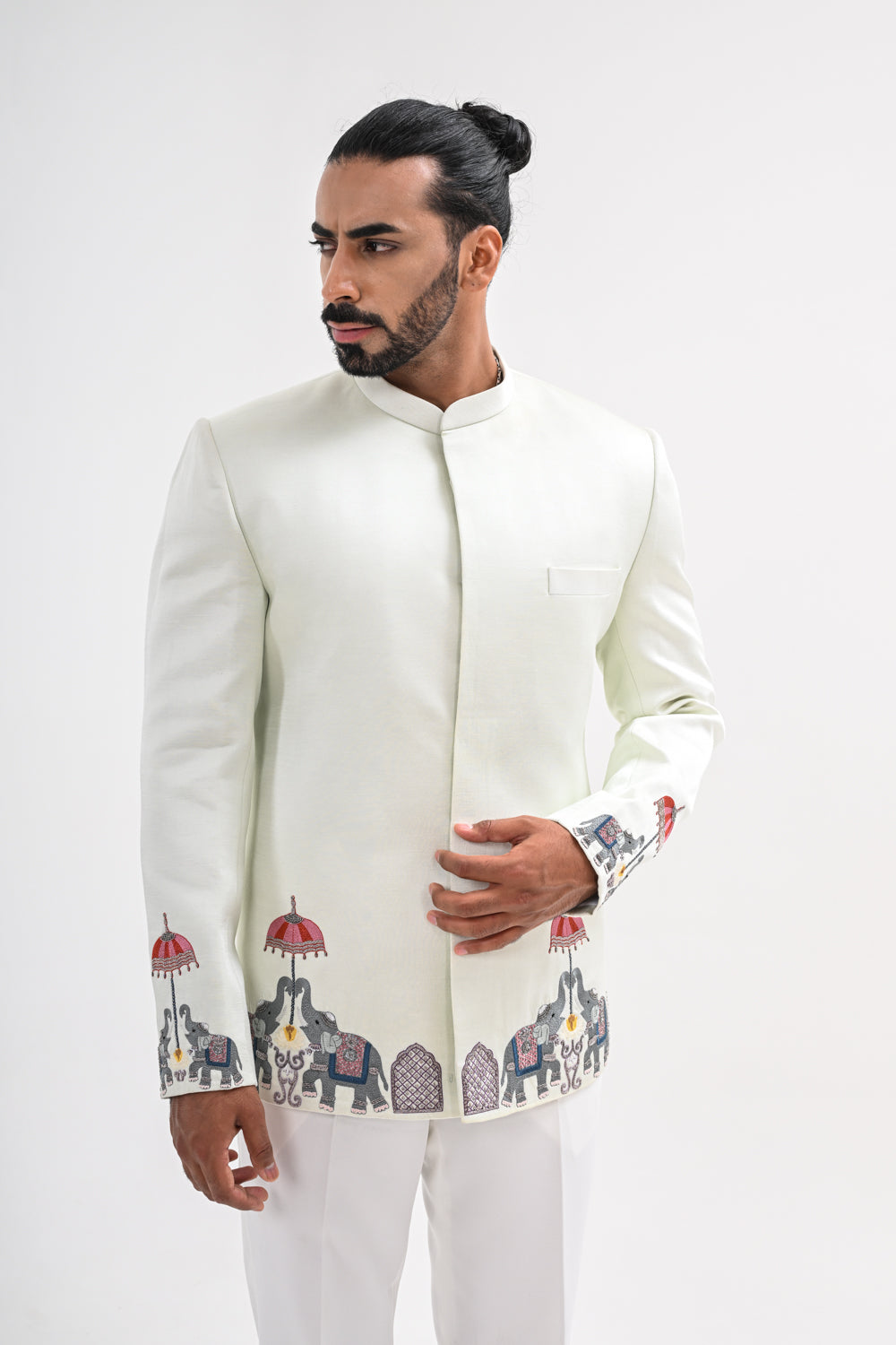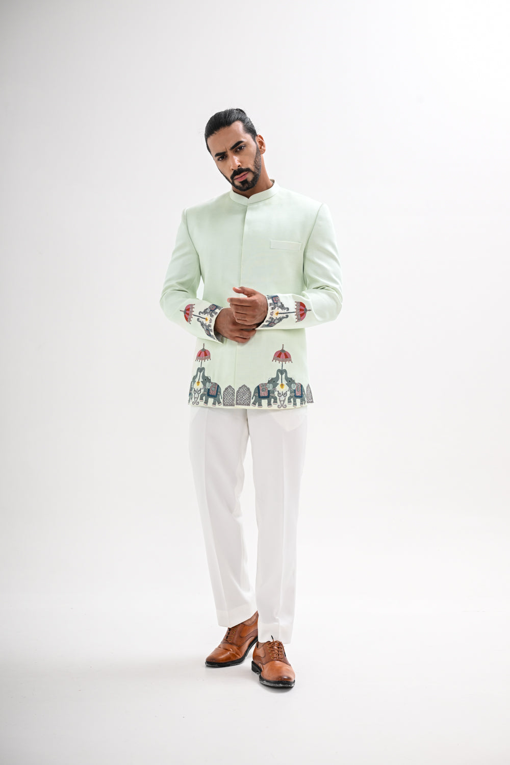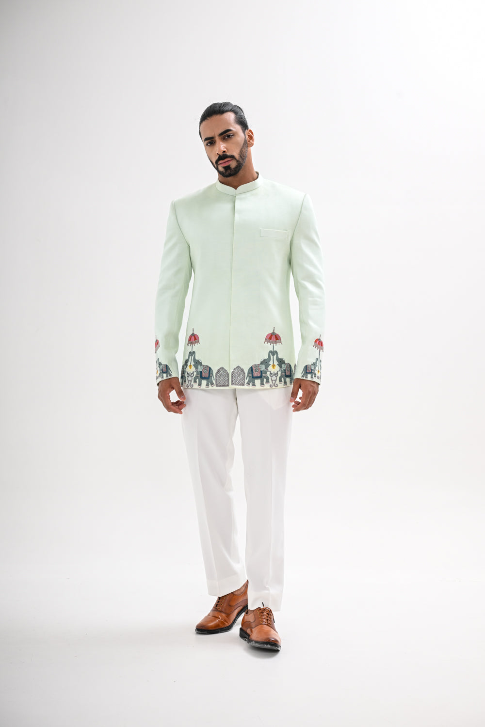 An exquisite handmade hand-embroidered light green Bandhgala Set, thoughtfully crafted on fine linen satin fabric. This elegant two-piece ensemble features a hand-embroidered Bandhgala paired with tailored trouser, reflecting a perfect balance of tradition and contemporary style. Please note, the actual color of the garment may vary slightly due to lighting conditions during photography.