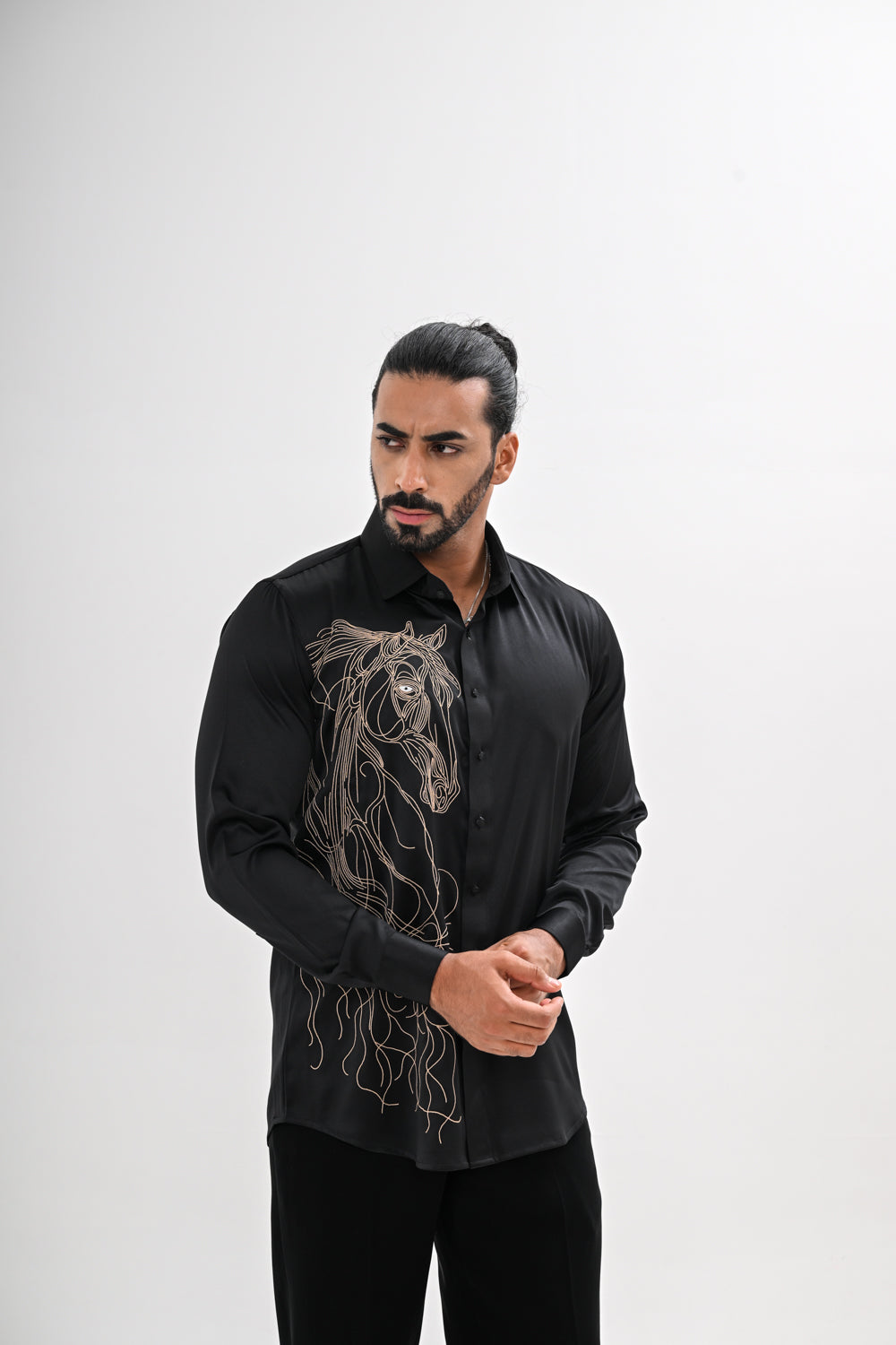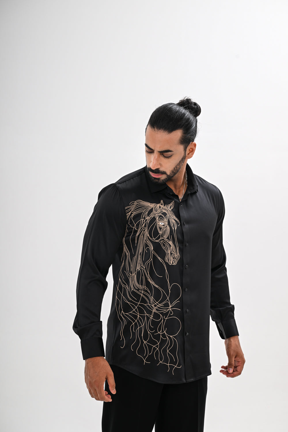 Featuring a Black shirt with hand embroidery done with silk threads and little bit of cutdana on Satin Glaze fabric. This contains only one piece. Color of the actual garment may vary due to lighting conditions during the shoot .