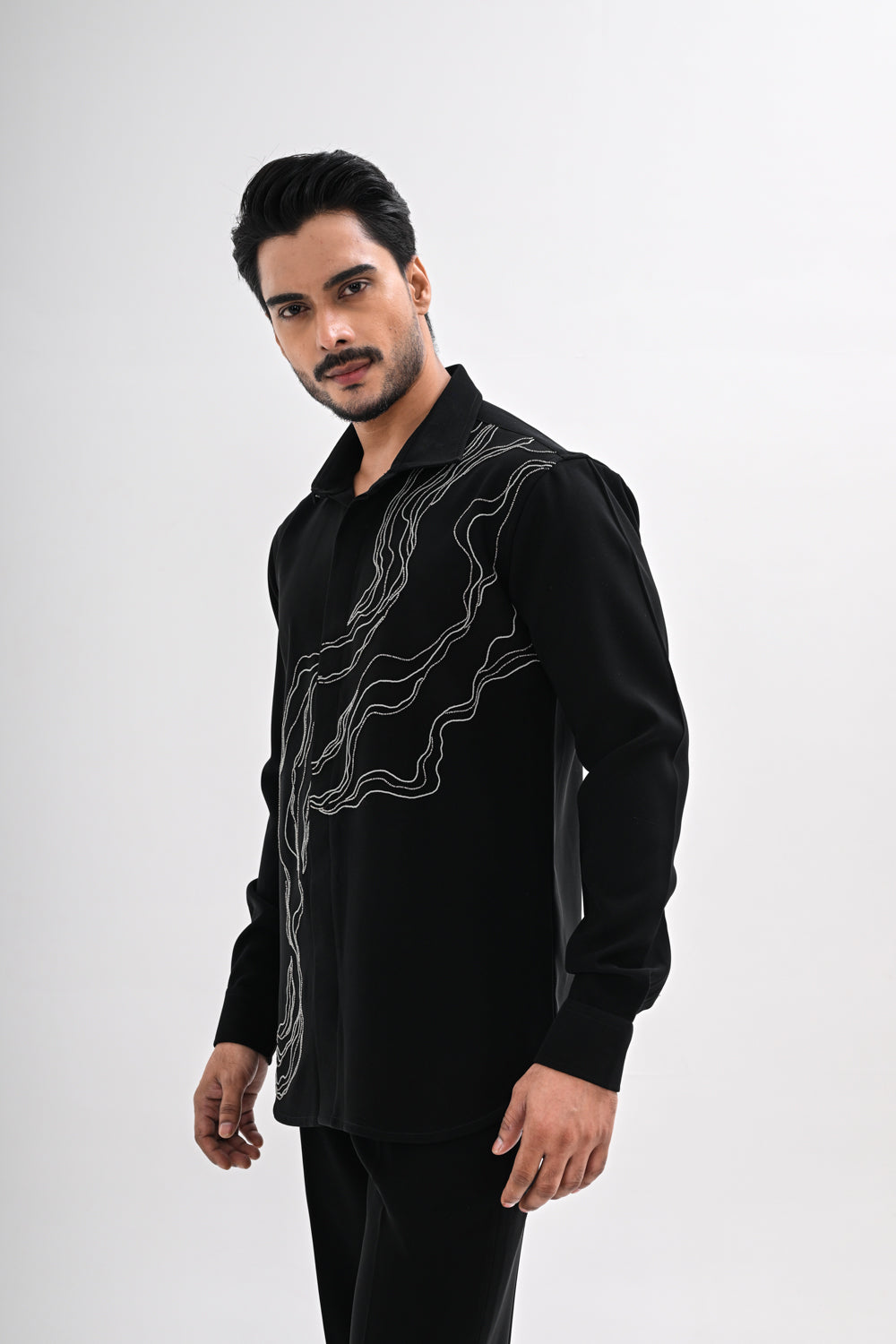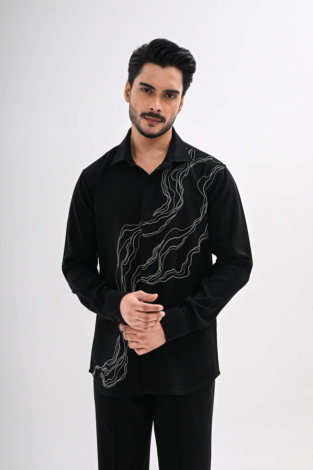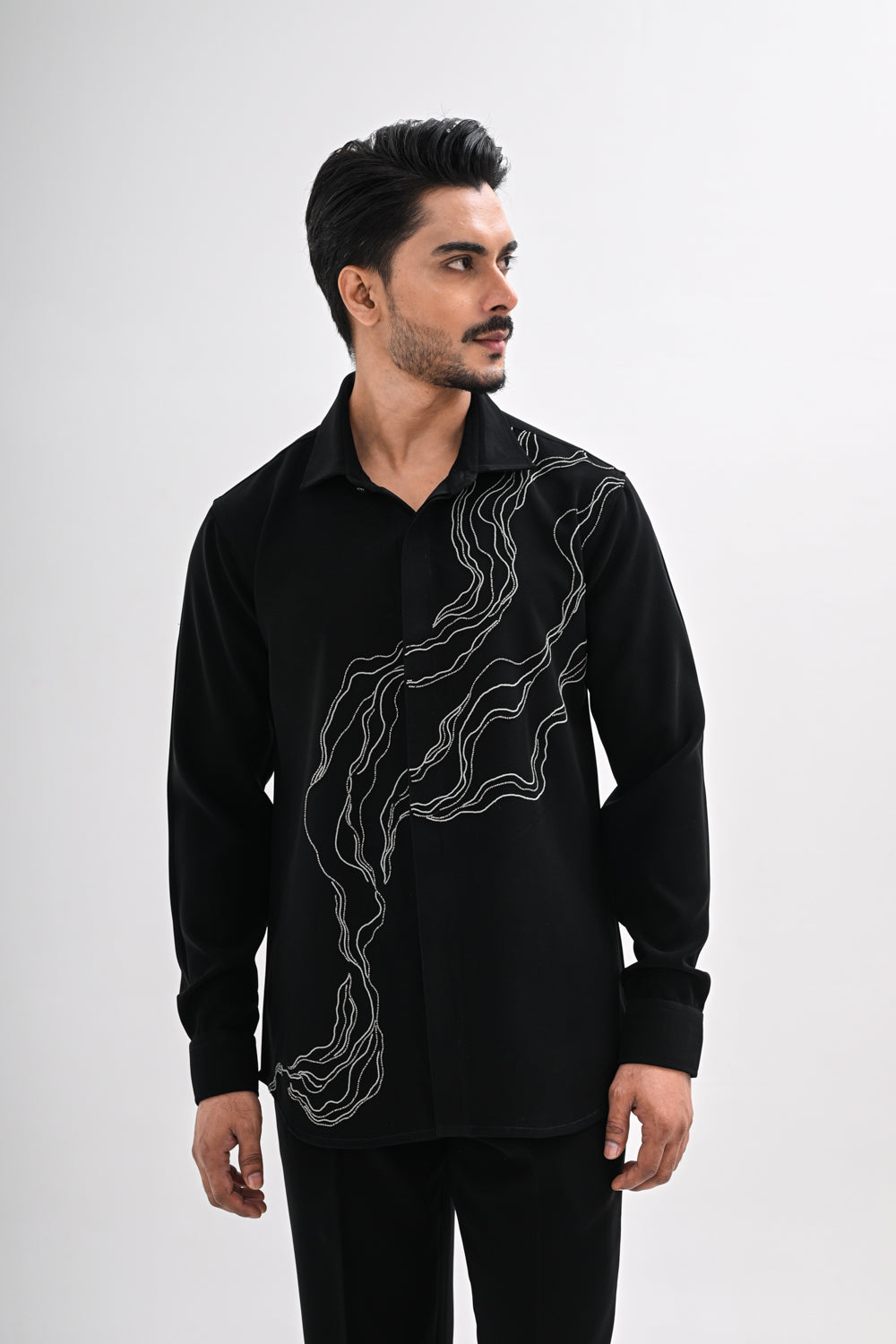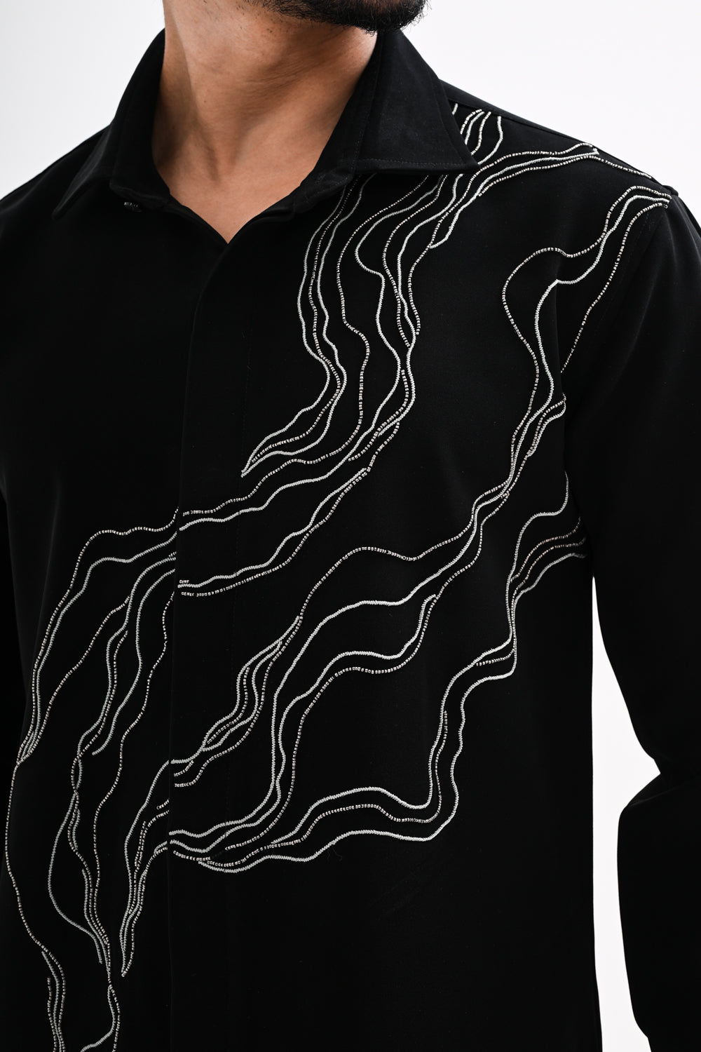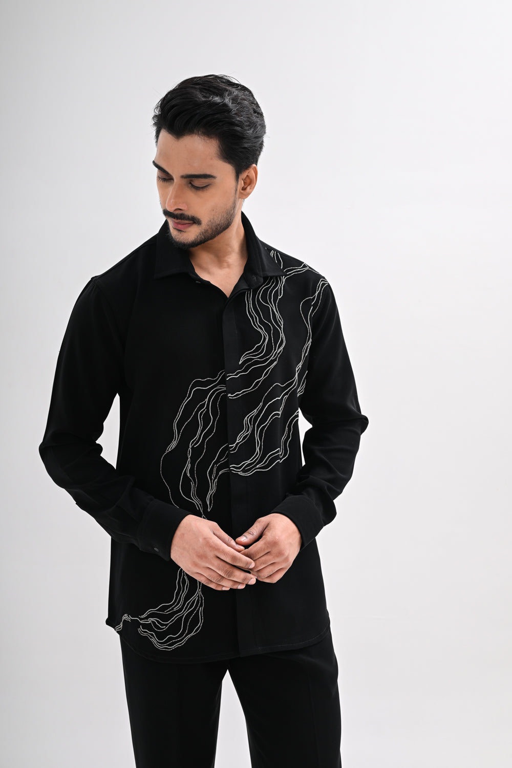 Featuring a Black shirt with hand embroidery done with silk threads and little bit of cutdana on banana crepe fabric. This contains only one piece. Color of the actual garment may vary due to lighting conditions during the shoot .