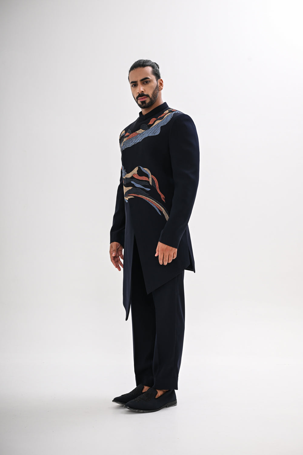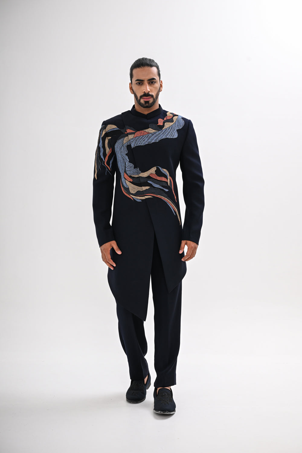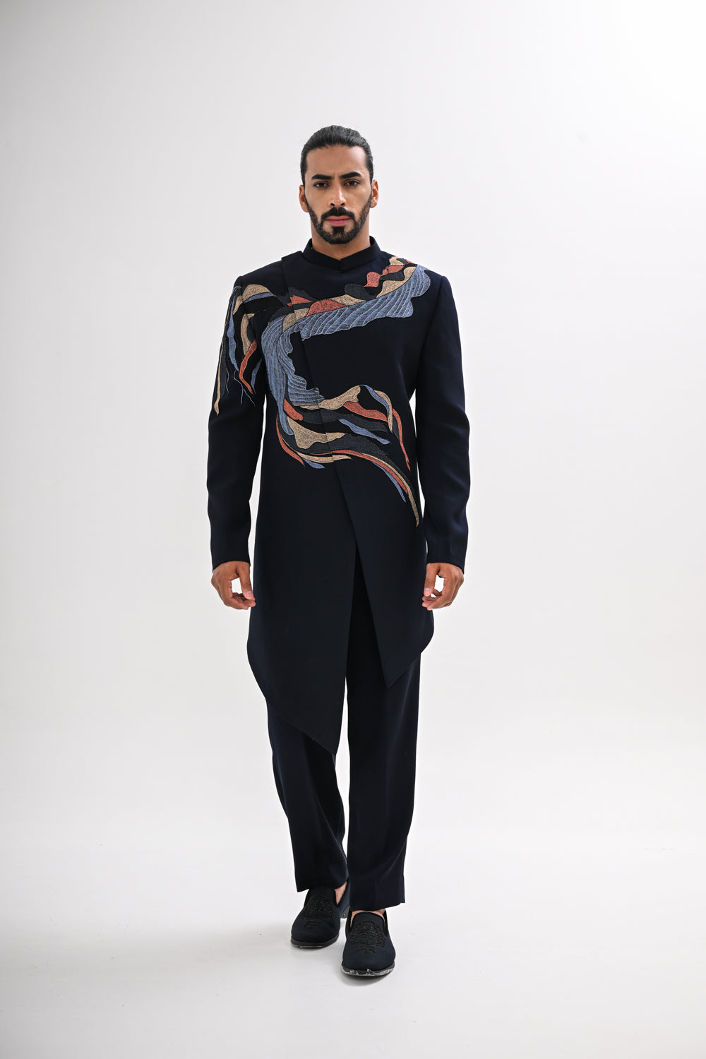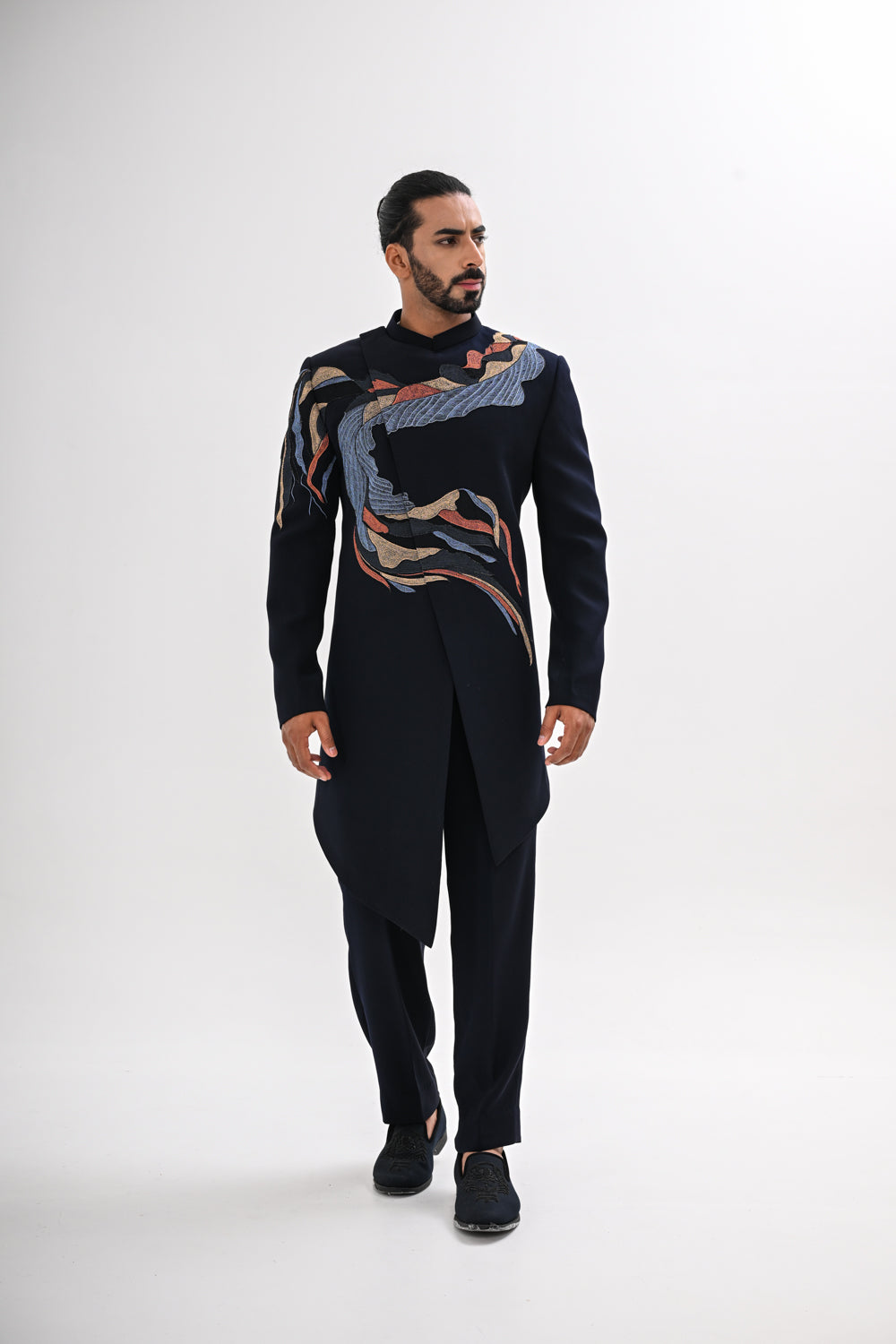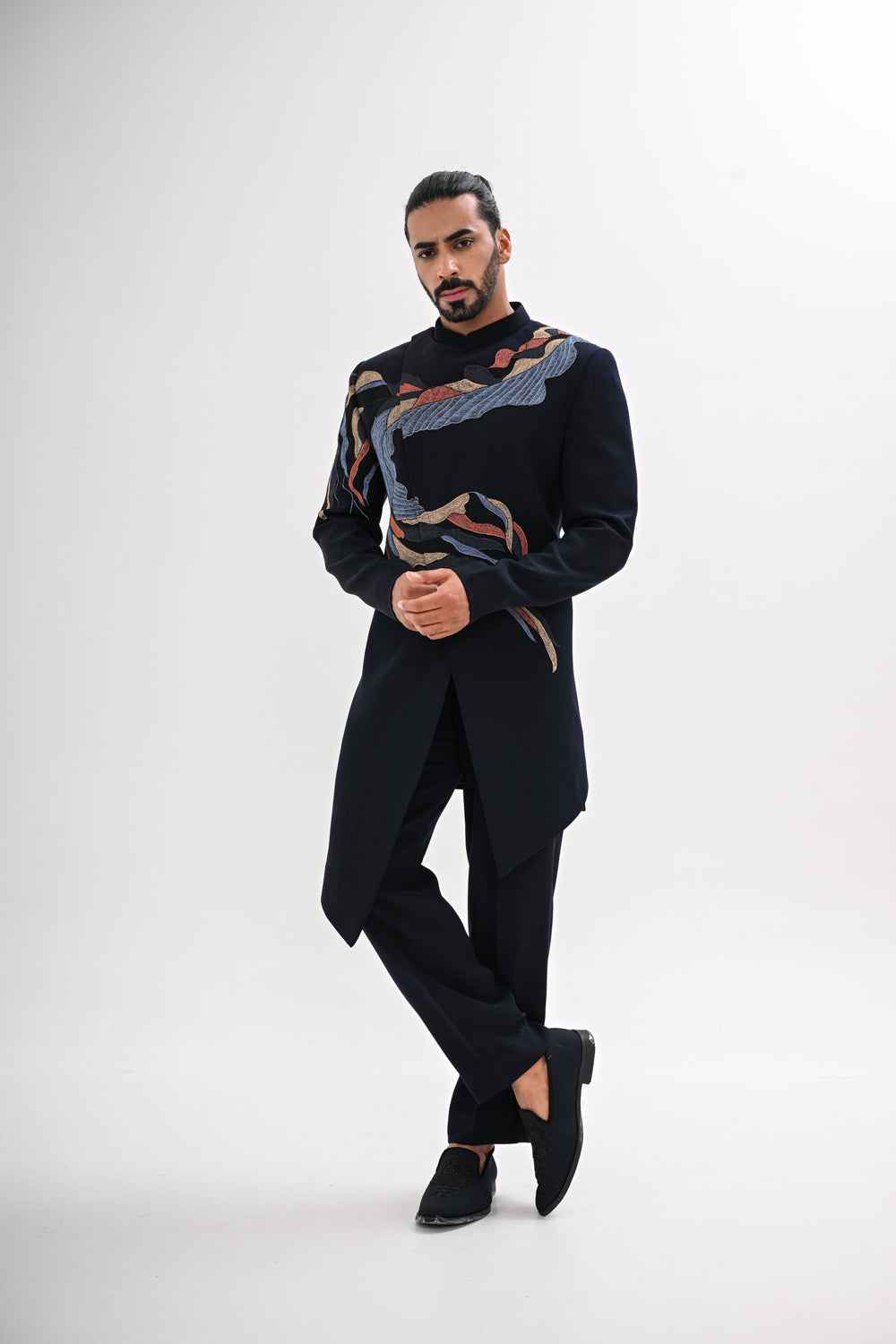 An exquisite handmade hand and machine-embroidered Dark Navy Blue Achkan Set, thoughtfully crafted on fine Banana Crepe fabric. This elegant two-piece ensemble features a hand and machine - embroidered Achkan paired with tailored trouser, reflecting a perfect balance of tradition and contemporary style. Please note, the actual color of the garment may vary slightly due to lighting conditions during photography.